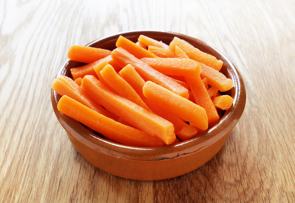 Нарежьте морковку брусочками, полейте ее несладким йогуртом и дайте ребенку. Или нарежьте яблоко кружочками и намажьте их джемом или арахисовой пастой.