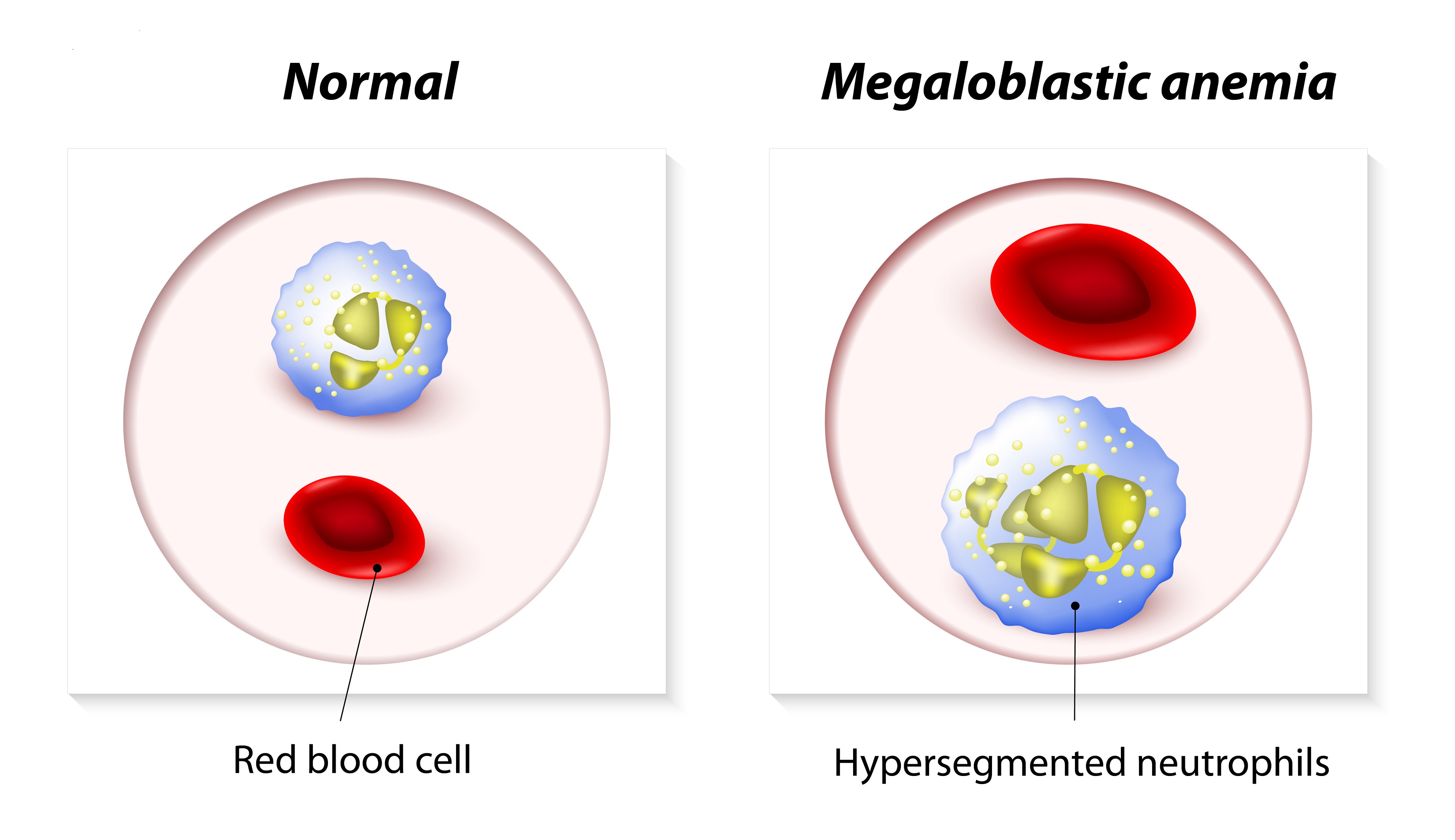 Слева — нормальные клетки крови, справа — таковые при мегалобластной анемии.