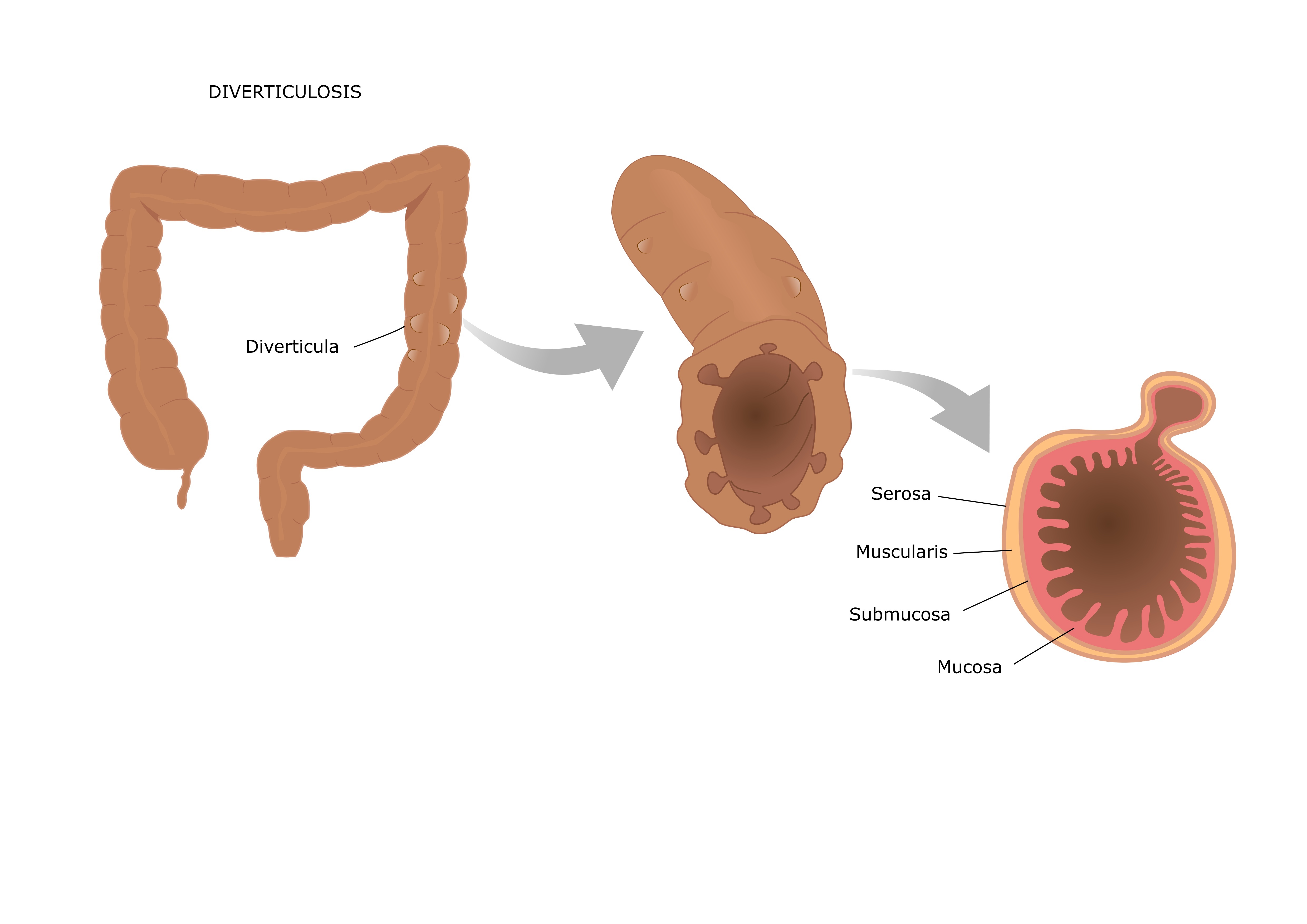 Ложные дивертикулы могут располагаться и в области нисходящей толстой кишки или сигмовидной. Их разделяют на тракционные и пульсионные. Пульсионные образуются вследствие давления на дефектную стенку кишки изнутри. Тракционные возникают в результате фиксации кишечной стенки спайками.